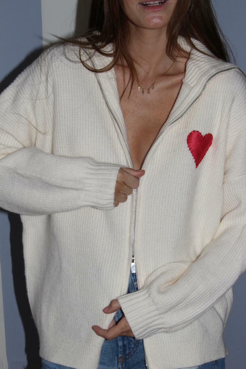 Sweater 50% acrilico 30% poliester 20% poliamida. Talle unico, con dos cierres en la parte delantera, que ambos suben hasta arriba y bajan. Se puede usar cerrado, o abierto como una camperita. Color beige, y con un corazon bordado a mano.
